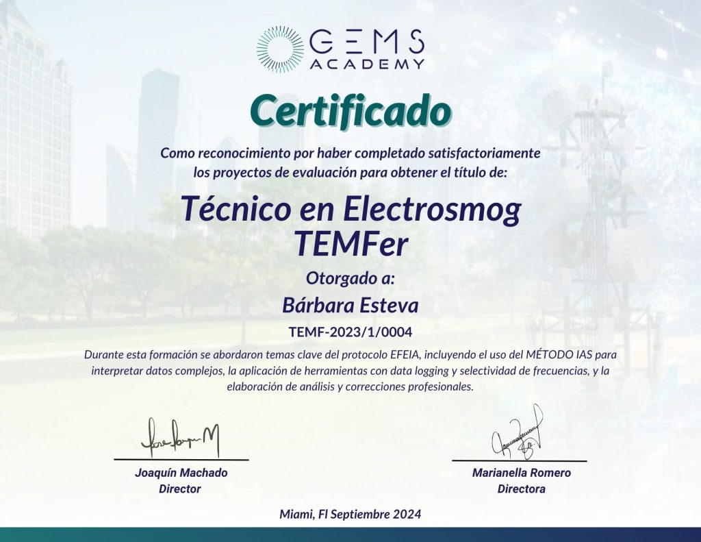 Consultora certificada como CEMFer / TEMFer por GEMS ACADEMY en contaminación electromagnética.