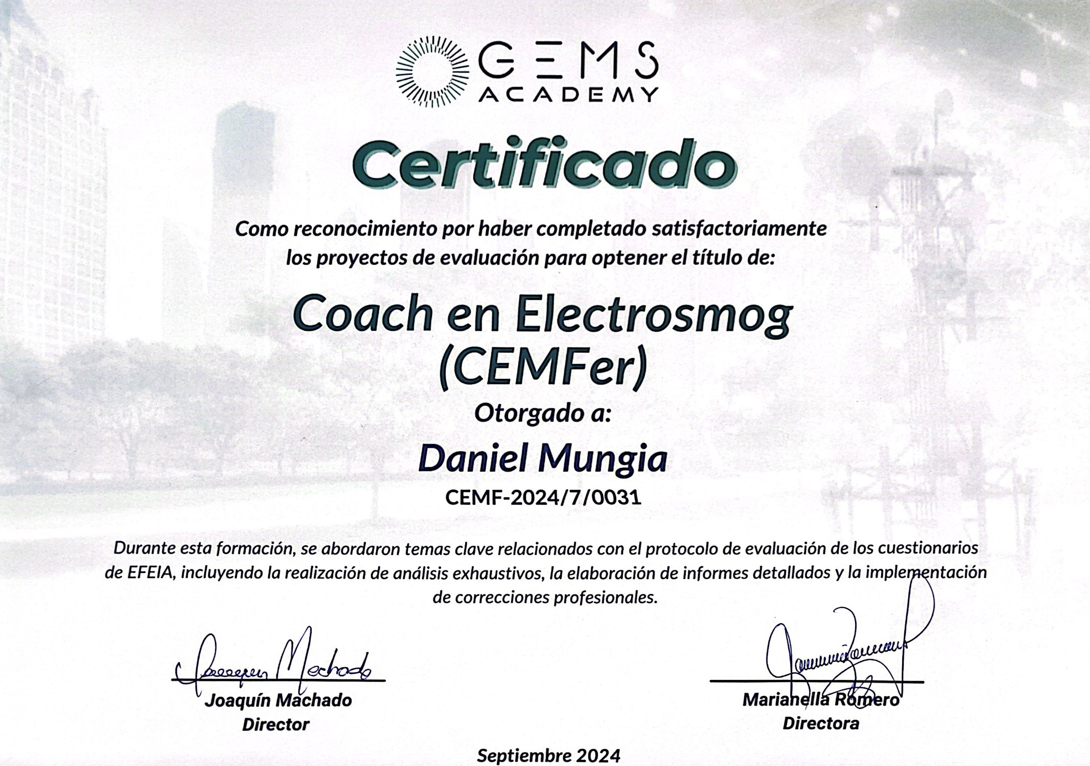 Consultora certificada como CEMFer / TEMFer por GEMS ACADEMY en contaminación electromagnética.