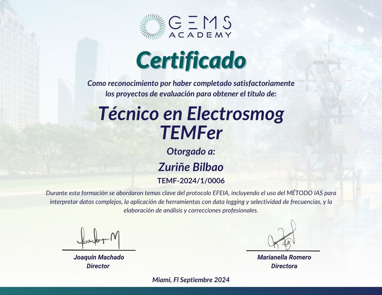 Consultora certificada como CEMFer / TEMFer por GEMS ACADEMY en contaminación electromagnética.